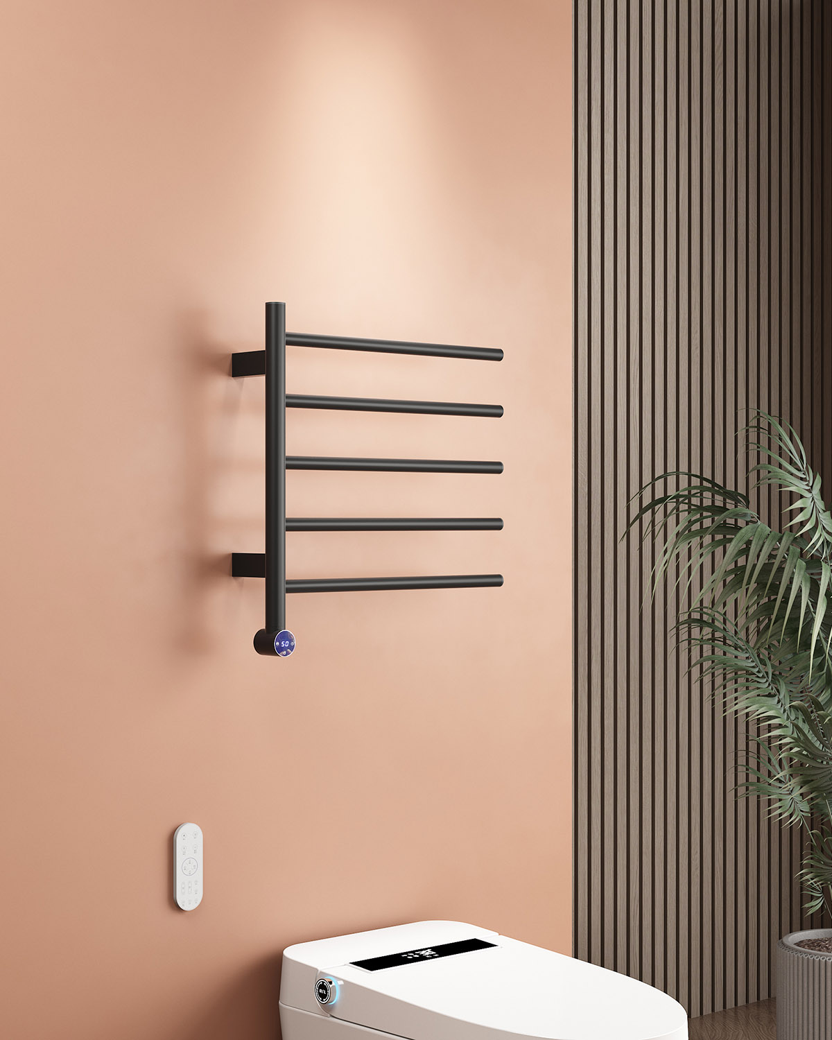 5桿液顯旋鈕開關(guān)電熱毛巾架 5 bar LCD display knob switch heated towel rail 材質(zhì)Material:SS201/SS304 功率Power:220V/80W 表面Surface:Black Painted 黑色噴塑 尺寸Size:500*110*500mm 包裝Ctn size:520*120*700mm