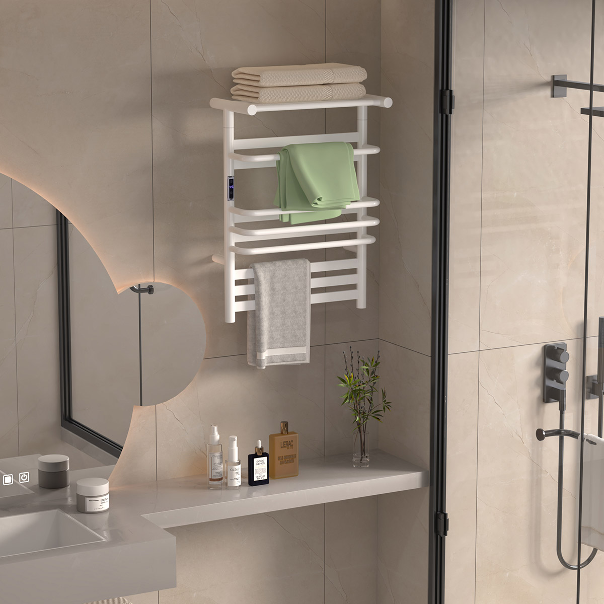 15桿時控開關電熱毛巾架 15 bar time switch heated towel rail 材質Material:SS201/SS304 功率Power:220V/220W 表面Surface:White Painted 白色噴塑 尺寸Size:500*250*680mm 包裝Ctn size:560*310*745mm