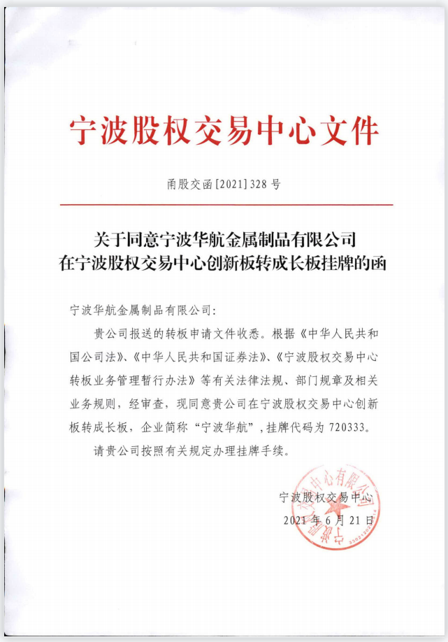 2021年6月21日,寧波華航金屬制品有限公司在寧波股權(quán)交易中心成長(zhǎng)版順利掛牌,企業(yè)簡(jiǎn)稱“寧波華航”,掛牌代碼為720333。