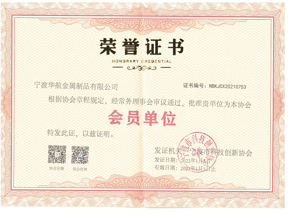 2022年1月5日,經寧波市科技創新協會的審議通過,寧波華航金屬制品有限公司被批準為協會會員單位。