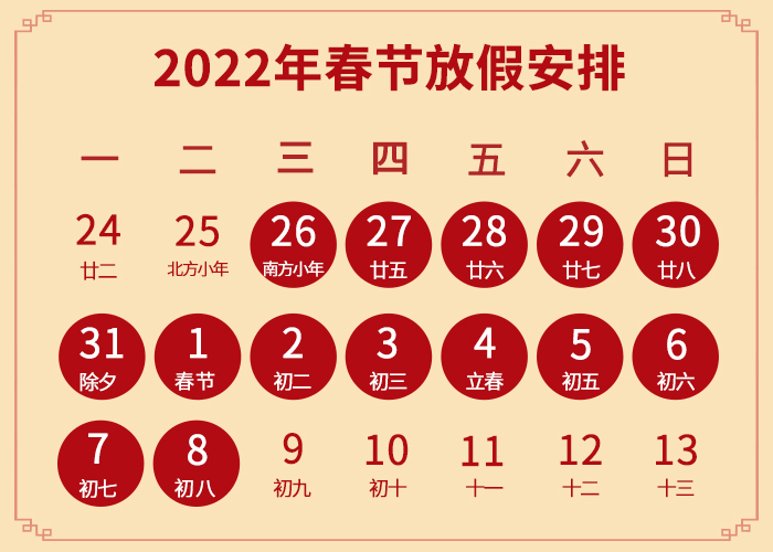 1月26日(臘月二十廿四)至2月8日(正月初八)放假調休,共14天,2月9日(正月初九)恢復正常上班。如有任何問題,請及時與對接業務員聯系。