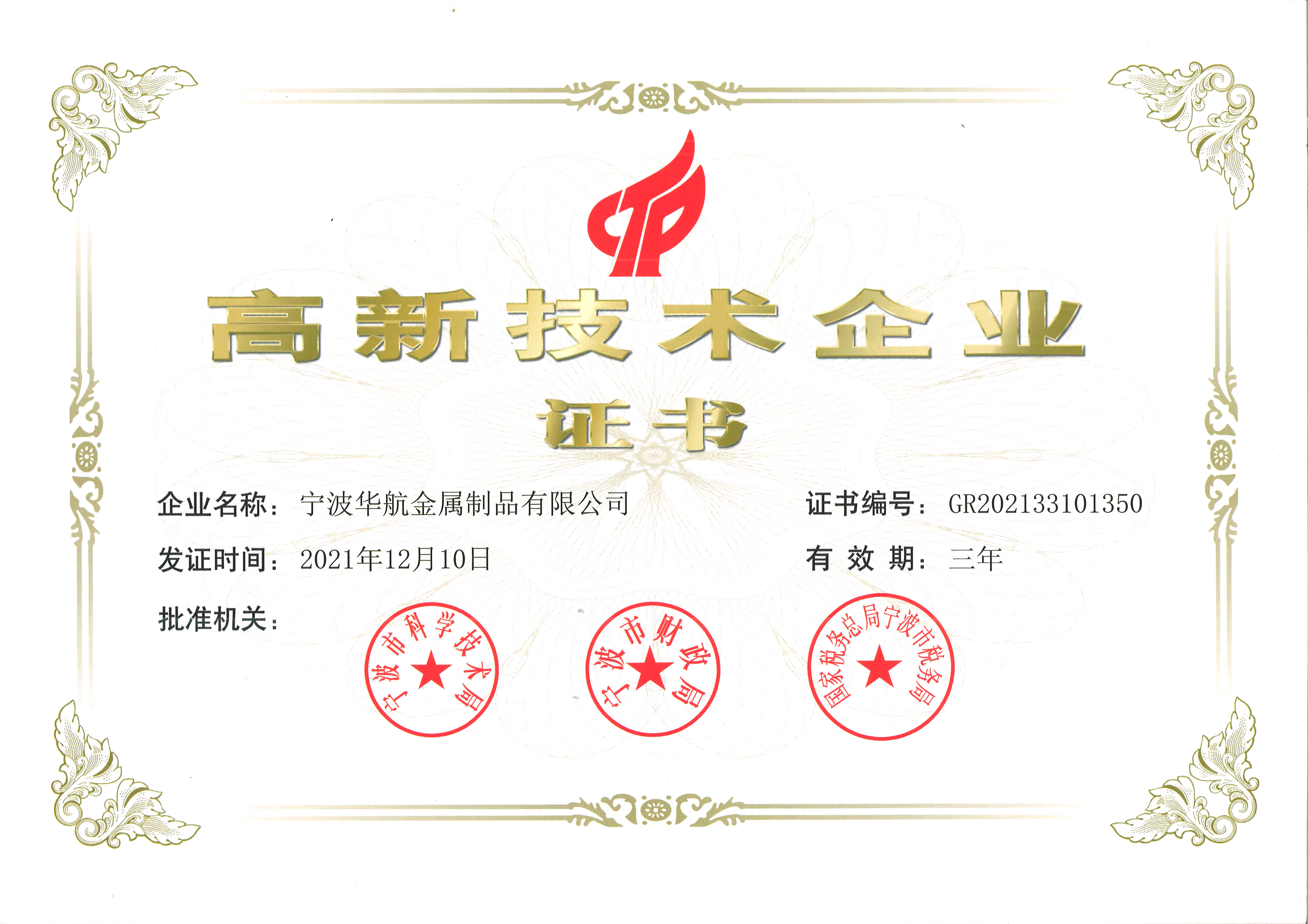 2021年12月10日,寧波華航金屬制品公司被認定為國家“高新技術企業”。寧波華航堅持走自主創新、持續創新的發展道路。其中公司擁有10多名的技術研發工程師,為公司在新品開發,技術革新方面提供前驅保障