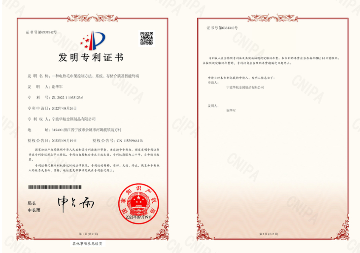 作為一家高新技術企業,公司始終以“質量求生存,創新促發展”為宗旨,積極開展各項創新工作。截至目前,公司累計已申請并獲得國家知識產權局發明專利,實用新型專利及外觀設計專利等60余項。這些專利成果,意味著寧波華航在電熱毛巾架領域的創新成果得到認可,為公司增強技術核心競爭力,和公司的再發展提供了強有力的科技支撐